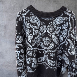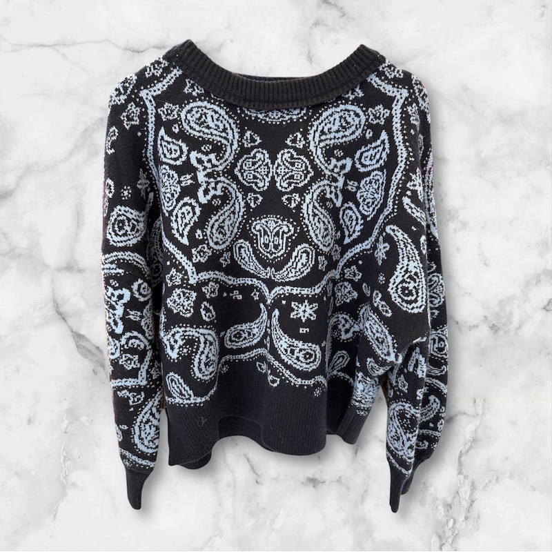Magnifique pull aux motifs BANDANA TRES CHAUD grâce à la laine (20%) et au cashemere (10%)!!!! Hyyyyper tendance toujours pour cet hiver 2025 ! Coupe large et serrée à la taille. Manches larges.